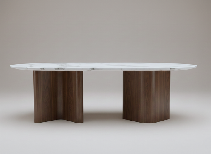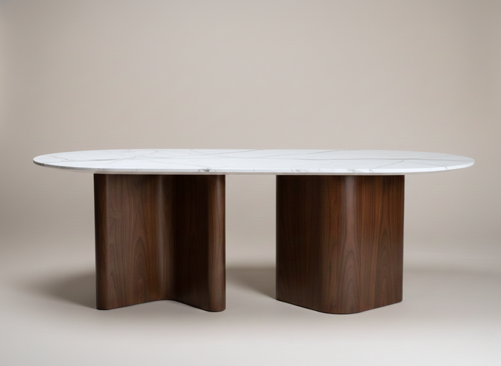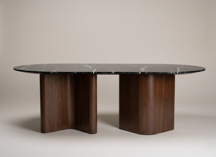 Gather around with family and friends for a night of laughs and memories. RO.ND Dining Table is the perfect addition to your dining room. The oval table design creates an inviting atmosphere, ideal for socializing with friends and family with friends and family. Its natural marble top is stain-resistant and easy to clean and its Oak veneer wood provides a sturdy base. While the contrast between the warmth of the veneer wood and the cold nature/tone of marble gives the table a unique look.